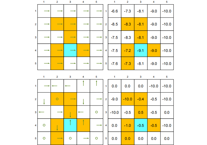 图\(2.7(b)\)显示了两种"不好"的策略及其对应的状态值。这两种政策之所以是不好的,是因为许多状态的行动在直觉上来看就是不合理的,而所获得的状态值更证明了这一推断,可以看出两种政策的状态值均为负值,且远小于图\(2.7(a)\)中的“好”的政策的状态值。