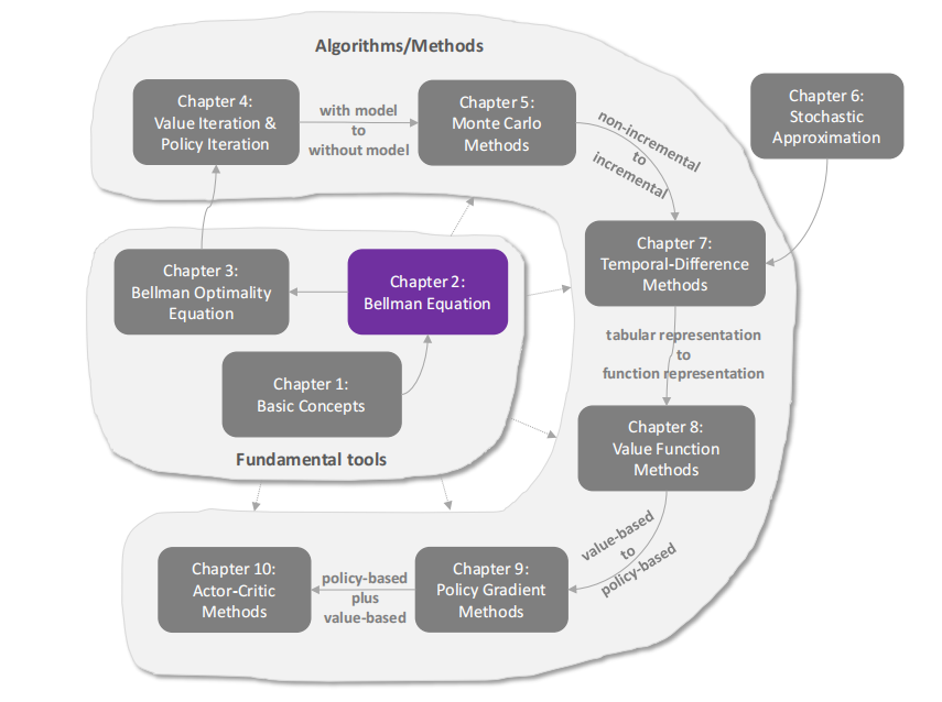 介绍 第二章将介绍一个核心概念和一个核心工具。核心概念是状态值,它是一个评价策略好坏的重要指标。既然状态值这么重要,那么我们应该如何分析它呢?答案就是核心工具贝尔曼方程(Bellman equation)。贝尔曼方程描述了所有状态值之间的关系。通过求解贝尔曼方程,我们就可以得到状态值,进而评价一个策略的好坏。 图\(2.1\): 本章在全书中的位置。