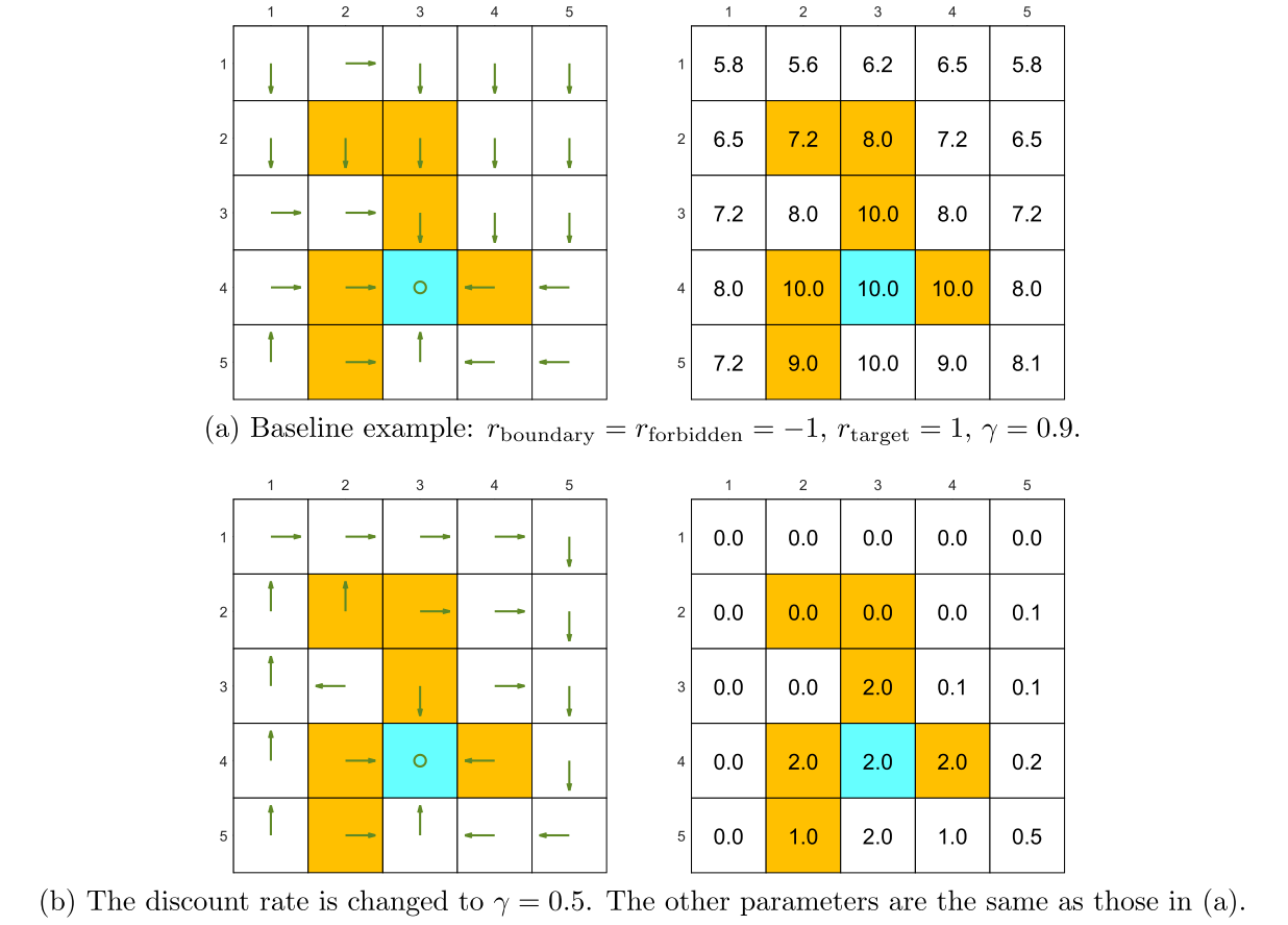 如图\(3.4(a)\)给出了在上述参数下的最优策略和最优状态值。有趣的是,此时的最优策略会选择穿过禁区以到达目标区域。例如,从状态(行=4,列=1)开始,智能体有两种策略到达目标区域。第一种选项是绕开所有禁区,长途跋涉到达目标区域;第二种选项是穿过禁区,走较短的路程到达目标区域,尽管智能体进入禁区时会获得负奖励,但是其总的折扣回报更高,反而优于第一种策略。实际上,由于\(\gamma\)值相对较大,因此最优策略是具有远见性,智能体愿意“冒险”。