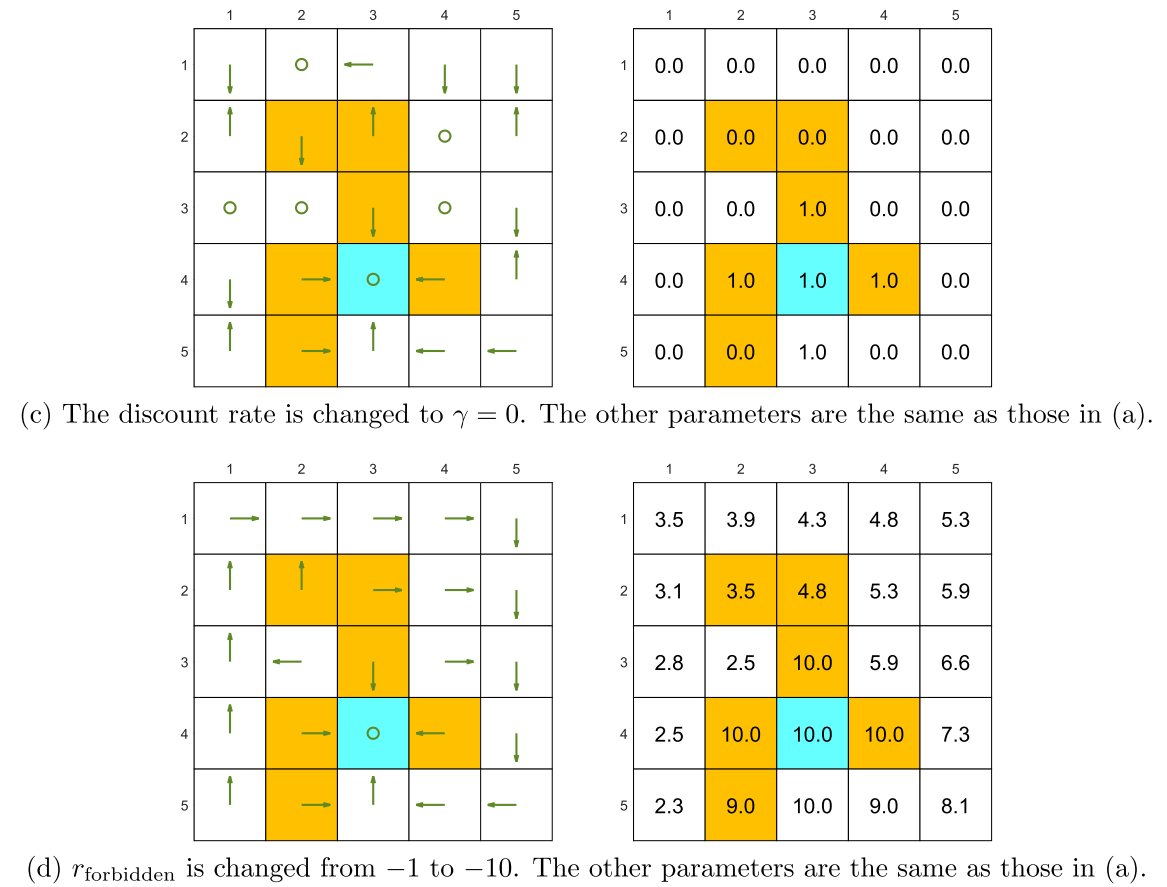 我们可以通过调整奖励值来改变最优策略。例如,如果我们希望禁止智能体进入禁区,可以增加其进入禁区所受到的惩罚。例如,当\(r_{forbidden}\)从\(-1\)改\(-10\),那么得到的最优策略可以避免所有禁区(见图\(3.4(d)\))。