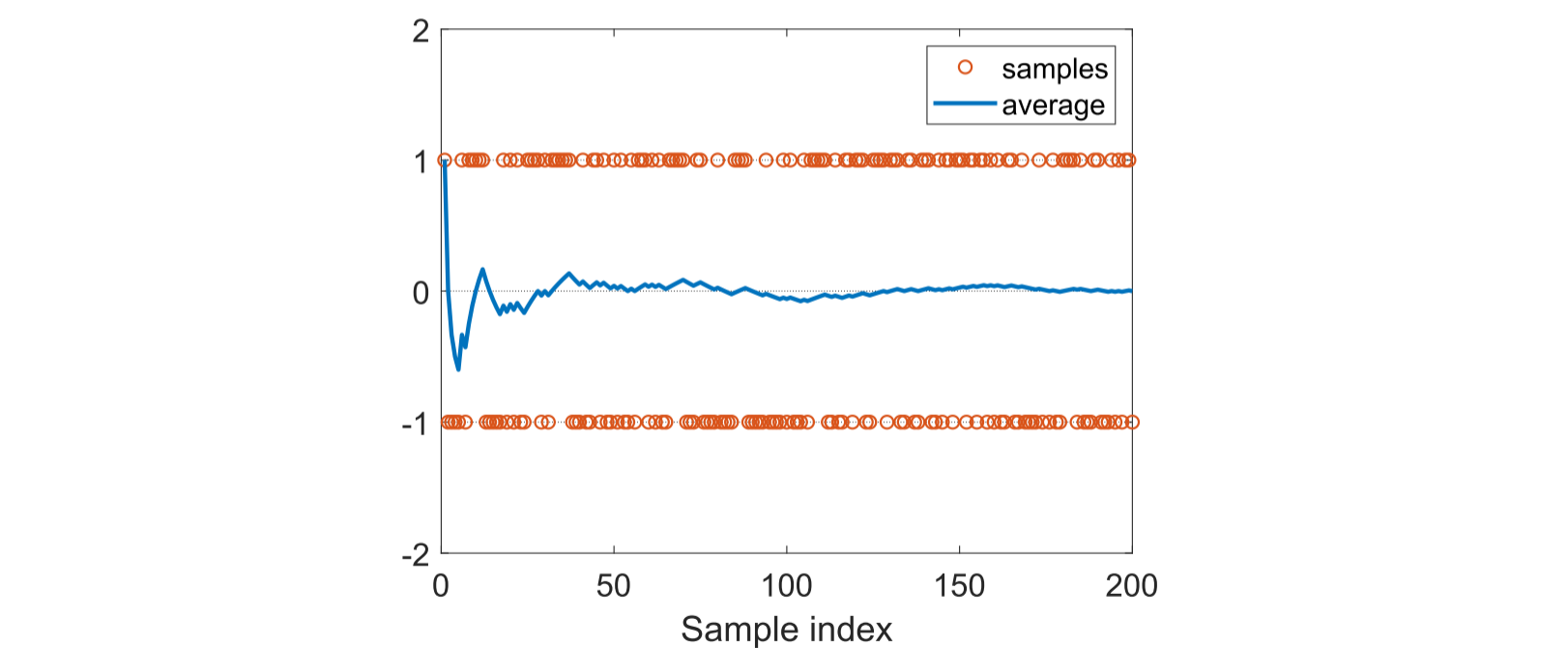 图\(5.2\):一个演示大数定律的例子。这里,样本是从{+1,−1}中按照均匀分布抽取的。随着样本数量的增加,样本的平均值逐渐收敛到零,即真实的期望值。