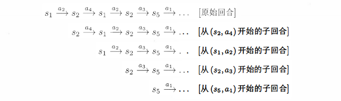 如上式所示,一个长的回合可以被看成很多个从不同状态-动作出发的子回合,因此可以估计多个不同状态-行动的行动值。通过这种方式,一个回合中的样本可以被更有效地利用。