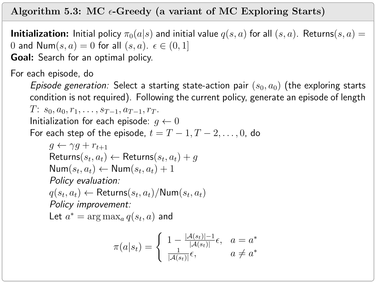 算法\(5.3\):MC \(\varepsilon\)-Greedy(MC exploring starts的变体)