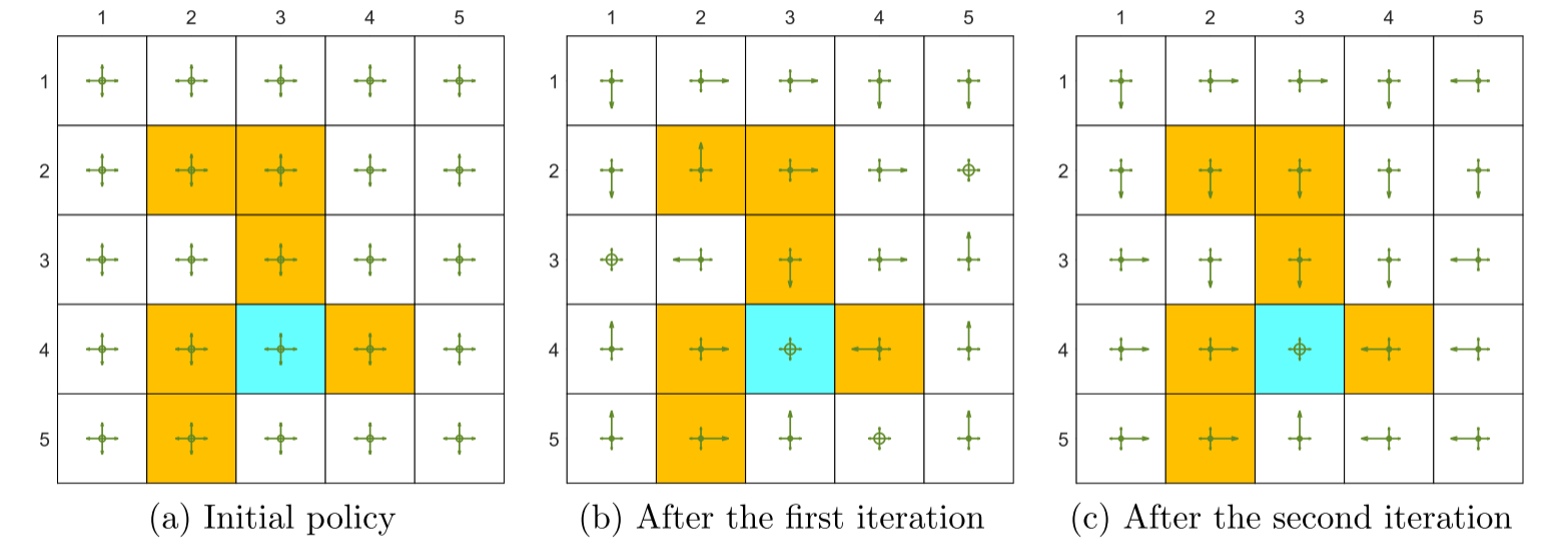 如图\(5.5\)所示,初始策略是一种均匀策略,采取任何行动的概率均为\(0.2\)。\(\varepsilon=0.5\)的最优\(\varepsilon\)-Greedy策略可以在两轮迭代后获得。尽管每次迭代仅使用一个回合,但因为所有状态-行动对都在这个回合中访问到了,所以它们的价值可以被准确估计。