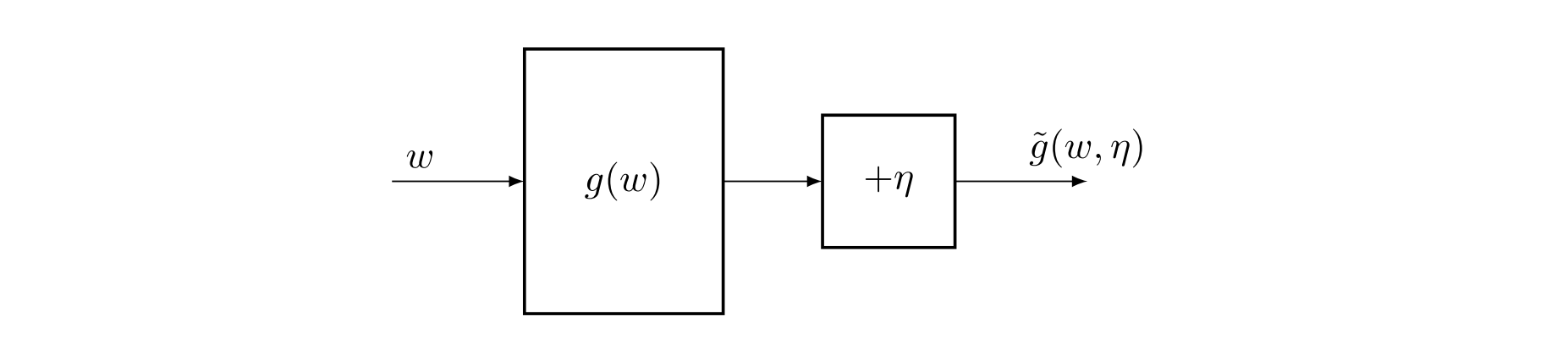 其中\(\eta\in\mathbb{R}\)是观测噪声,而且可能不是高斯分布的。这个函数是一个一个黑盒系统,只有输入\(w\)和噪声观测值\(\tilde{g}(w,\eta)\)是已知的(见图\(6.2\))。我们的目标是利用\(w\)和\(\tilde{g}\)求解\(g(w) = 0\)。