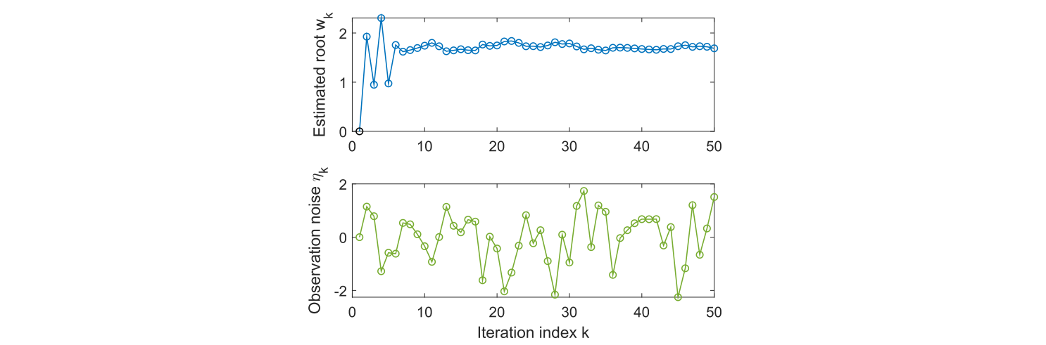 值得一提的是,\(a_k\) 在实际中常常会被选择为一个小的正数。此时,条件 \(\sum_{k=1}^{\infty} a_k = \infty\) 仍然成立,但是条件 \(\sum_{k=1}^{\infty} a_k^2 < \infty\) 不再成立。这样选择 \(a_k\) 的原因是它能够很好地利用后面(\(k\) 比较大时)得到的样本。否则,如果 \(a_k\) 逐渐收敛到 0,那么当 \(k\) 较大时,得到的数据对 \(w_k\) 的影响已经微乎其微了。实际上,当 \(a_k\) 恒等于一个正数时,算法仍然可以在某种意义上收敛,详情参见 [24, 第 1.5 节]]。实际上,我们之所以希望 \(k\) 较大时样本数据仍有效,基本原因是这可以应对时变系统(例如函数 \(g(w)\) 随时间缓变化)。