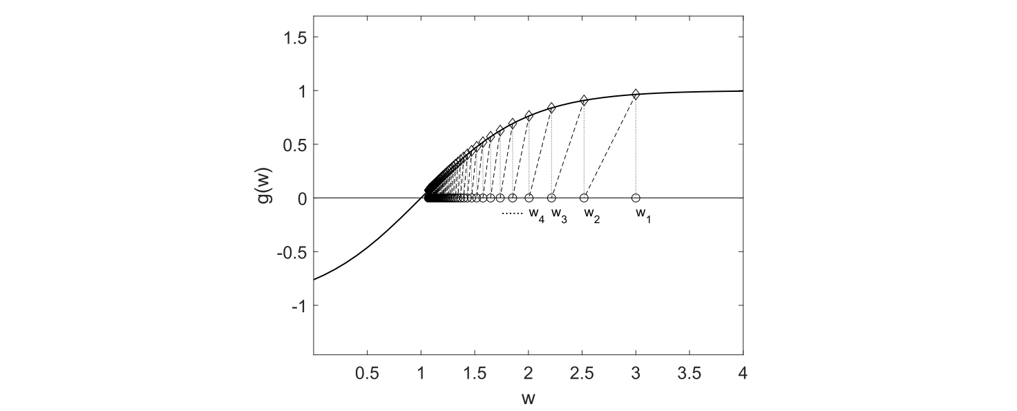 其中\(w\in\mathbb{R}\)是未知变量,\(g:\mathbb{R} \rightarrow \mathbb{R}\)是一个函数。许多问题都可以表述为上面方程的求根问题。例如,如果\(J(w)\)是一个需要优化的目标函数,这个优化问题可以转换为求解\(g(w)=\nabla_wJ(w)=0.\)。另外,如果方程右边有一个常数,例如\(g(w) = c\),这样的方程仍然可以通过将\(g(w)-c\)转换为上述的形式。