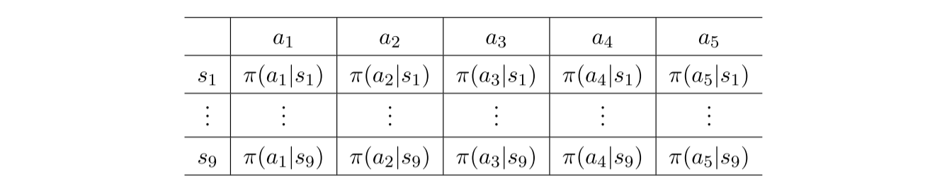 表\(9.1\):策略的表格化表示。该表包含\(9\)个状态,每个状态对应\(5\)个行动。